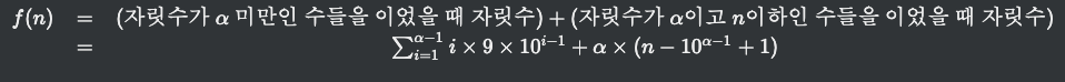 ์ ๋ ฅ์ผ๋ก ์ฃผ์ด์ง $n (1 \le n \le 10^8)$์ ์๋ฆฟ์๋ฅผ $\alpha$๋ผ๊ณ ํ๊ณ 1๋ถํฐ $n$๊น์ง ์ด์ด ์ธ ๋ ๋ง๋ค์ด์ง๋ ์๋ก์ด ์์ ์๋ฆฟ์๋ฅผ $f(n)$์ด๋ผ๊ณ ํ ๋, $f(n)$์ ๊ตฌํ๋ ๊ฒ์ด ์ด ๋ฌธ์ ์ ํต์ฌ์ด๋ค.