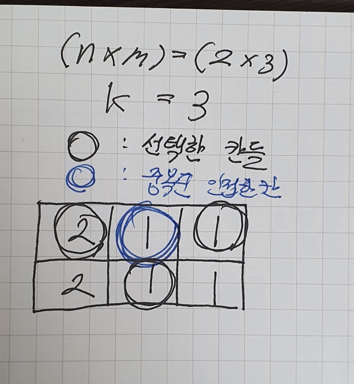 $g$์ ๊ฐ ์นธ์ ํ๋์ vertex๋ผ๊ณ ์๊ฐํด๋ณด์. ๊ทธ๋ ๋ค๋ฉด ์ด ๋ฌธ์ ๋ $n \times m$๊ฐ์ vertex๋ค ์ค์์ ์ธ์ ํ ์นธ๋ค์ ์ ์ธํ๊ณ $k$๊ฐ์ vertex๋ฅผ ์ ํํ ๋ ์ป์ ์ ์๋ ์ต๋๊ฐ์ ๊ตฌํ๋ backtracking ๋ฌธ์ ๋ก ์ดํดํ ์ ์๋ค.