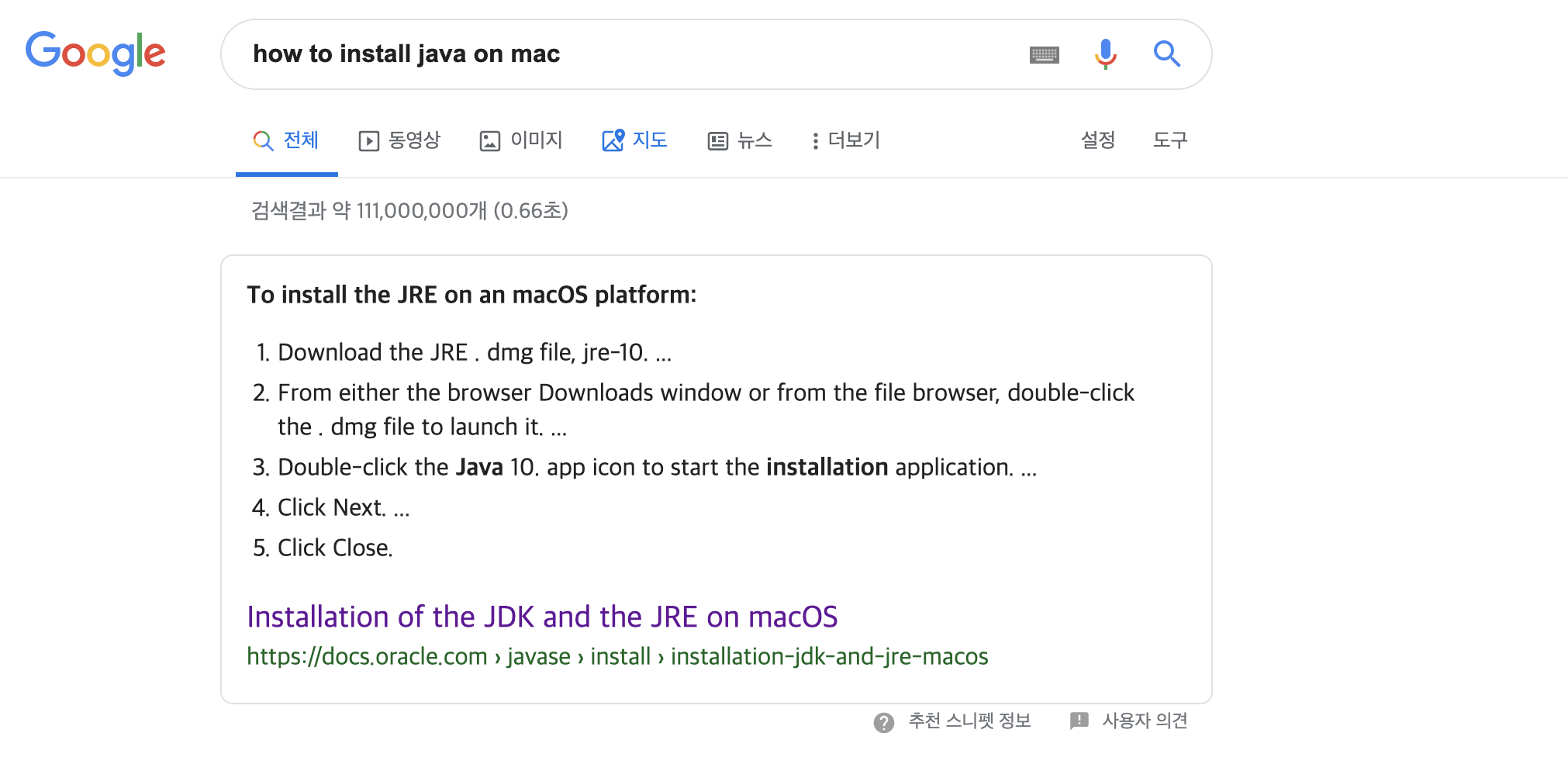 그래도 오랜만에 기초부터 다시 배울 수 있는 기회라고 생각하고 Java부터 차근차근 설치하기 위해 'how to install java on mac'이라고 구글링했다.