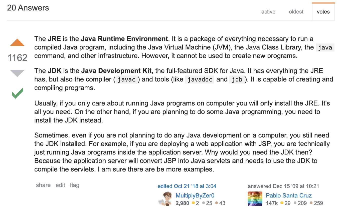 오랜만에 JDK, JRE를 봐서 JDK와 JRE가 무엇이고 둘 중 무엇을 설치해야 하는지 몰랐다. 그래서 'difference between JDK and JRE'라고 구글링한 결과 아래와 같은 stackoverflow 답변을 볼 수 있었다.