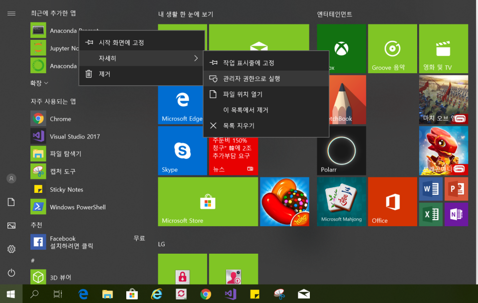 Anaconda Prompt 관리자 권한으로 실행 Windows를 사용하는 학우님들은 다음과 같이 Anaconda prompt를 관리자 권한으로 실행하셔야 합니다.