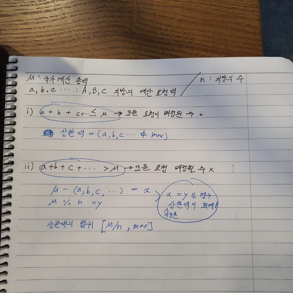 κ° μ§λ°©μμ μμ²νλ μμ°μ΄ λ΄κΈ΄ λ°°μ΄ budgetsκ³Ό μ΄ μμ° Mμ΄ λ§€κ°λ³μλ‘ μ£Όμ΄μ§ λ, μμ 쑰건μ λͺ¨λ λ§μ‘±νλ μνμ‘μ return νλλ‘ solution ν¨μλ₯Ό μμ±ν΄μ£ΌμΈμ.