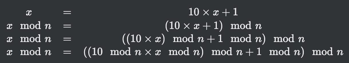 λ€ννλ λ¬Έμ μμ μꡬνλ κ²μ $x$ μμ²΄κ° μλλΌ $x \mod n == 0$μ λ§μ‘±ν λμ μλ¦Ώμμ΄λ€. λ°λΌμ, μ€μν κ²μ $x$κ° μλλΌ $x \mod n$μ΄λΌλ κ²μ μ μ μλ€. κ·Έλμ μ μμ μ€λ₯Έμͺ½ λμ 1μ λΆμΌ λ $x = 10 \times x + 1$μ΄ μλ $x = (10 \times x + 1) \mod n$μ νλ©΄ λλ€. μ΄λ₯Ό ννν μμμ μλμ κ°λ€.